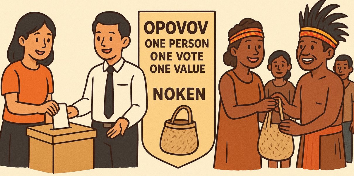 Dengan semangat “Beda Cara, Satu Tujuan”, baik OPOVOV maupun Noken sama-sama menjadi bagian dari perjalanan demokrasi bangsa yang terus tumbuh dan beradaptasi dalam keberagaman. OPOVOV mengajarkan kita tentang kesetaraan suara, sementara Noken mengingatkan kita tentang kebersamaan dan musyawarah. Dua sistem ini, meski berbeda dalam pelaksanaan, sama-sama mengarahkan pada satu tujuan besar: demokrasi yang berkeadilan, inklusif, dan berakar pada nilai-nilai bangsa Indonesia.