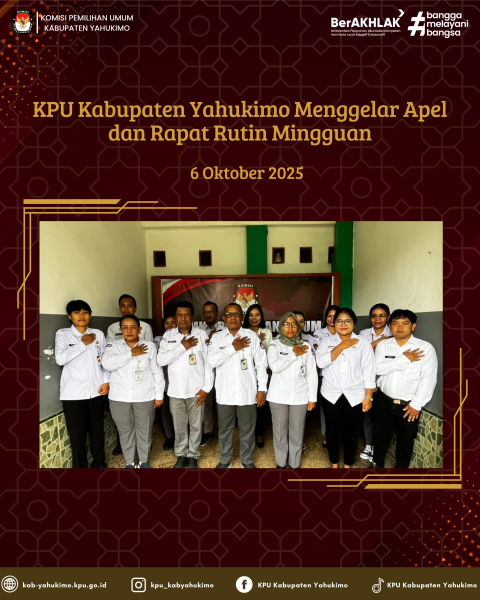 Jayapura – Komisi Pemilihan Umum (KPU) Kabupaten Yahukimo kembali melaksanakan apel rutin awal pekan pada Senin, 6 Oktober 2025 pukul 08.00 WIT yang diikuti oleh seluruh staf sekretariat KPU Kabupaten Yahukimo.