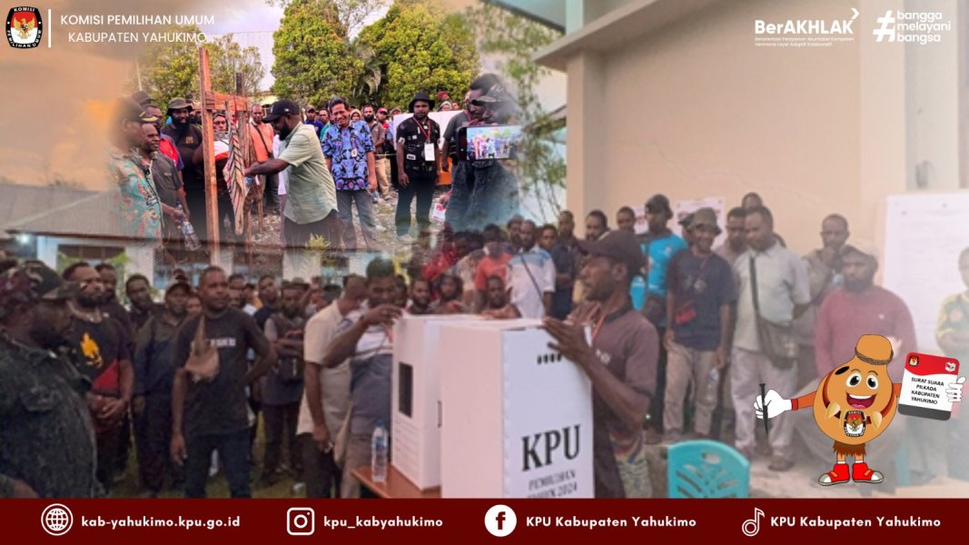 Yahukimo — Komisi Pemilihan Umum (KPU) Kabupaten Yahukimo melaksanakan simulasi pemungutan suara gabungan secara sistem nasional dan dengan sistem noken sebagai bagian dari upaya memastikan seluruh mekanisme pemungutan suara berjalan sesuai aturan dan kearifan lokal yang berlaku di wilayah Papua Pegunungan. Kegiatan simulasi yang berlangsung di halaman Aula OKMC Kabupaten Yahukimo, pada Jumat, 08 November 2024, pukul 14.00 WIT – Selesai, diikuti oleh Ketua dan Anggota KPU Yahukimo, sekretariat KPU, Panitia Pemilihan Distrik (PPD), Panitia Pemungutan Suara (PPS), petugas Kelompok Penyelenggara Pemungutan Suara (KPPS), serta perwakilan tokoh masyarakat dan kepala suku serta di awasi langsung oleh Bawaslu Kabupaten Yahukimo untuk memastikan kesiapan semua pihak, sekaligus membangun kepercayaan publik terhadap proses pemilu yang jujur dan adil.