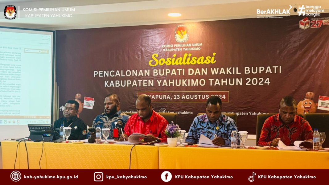 Kegiatan sosialisasi dilaksanakan pada Selasa, 13 Agustus 2024 bertempat di Hotel Horison Kotaraja Jayapura, acara dibuka oleh Ketua KPU Kabupaten Yahukimo, Penas Bahabol di dampingi Anggota KPU Kabupaten Yahukimo, Panus Yahuli, Manius Bahabol, dan Yan Kobak dan di dampingi Plh.Kasubag Teknis & Hukum, Kasubag Parmas & SDM, serta Kasubag Rendatin. Turut hadir dalam kegiatan Sosialisasi Pencalonan Bupati dan Wakil Bupati Kabupaten Yahukimo Tahun 2024 diantaranya Asisten 1 Kabupaten Yahukimo, Perwakilan Dinas Kesehatan Kabupaten Yahukimo, Ketua dan Anggota Bawaslu Kabupaten Yahukimo, serta Pimpinan Partai Politik. Dalam kegiatan tersebut, KPU Kabupaten Yahukimo memaparkan secara rinci mengenai tahapan pelaksanaan Pilkada, mulai dari pendaftaran, penelitian dokumen, penetapan pasangan calon, hingga masa kampanye dan hari pemungutan suara.