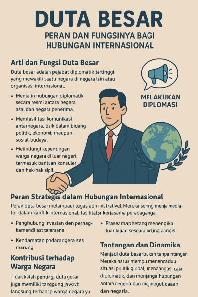 Duta besar bukan sekadar simbol diplomasi, tetapi pilar penting dalam menjaga kepentingan nasional, memperluas kerjasama internasional, dan melindungi warga negara di luar negeri. Fungsi dan perannya yang luas menjadikan posisi ini krusial bagi kelancaran hubungan antarnegara dan citra Indonesia di mata dunia. Dengan kehadiran mereka, negara mampu bersuara di forum global, memperkuat diplomasi, dan memastikan kepentingannya terlindungi di kancah internasional.